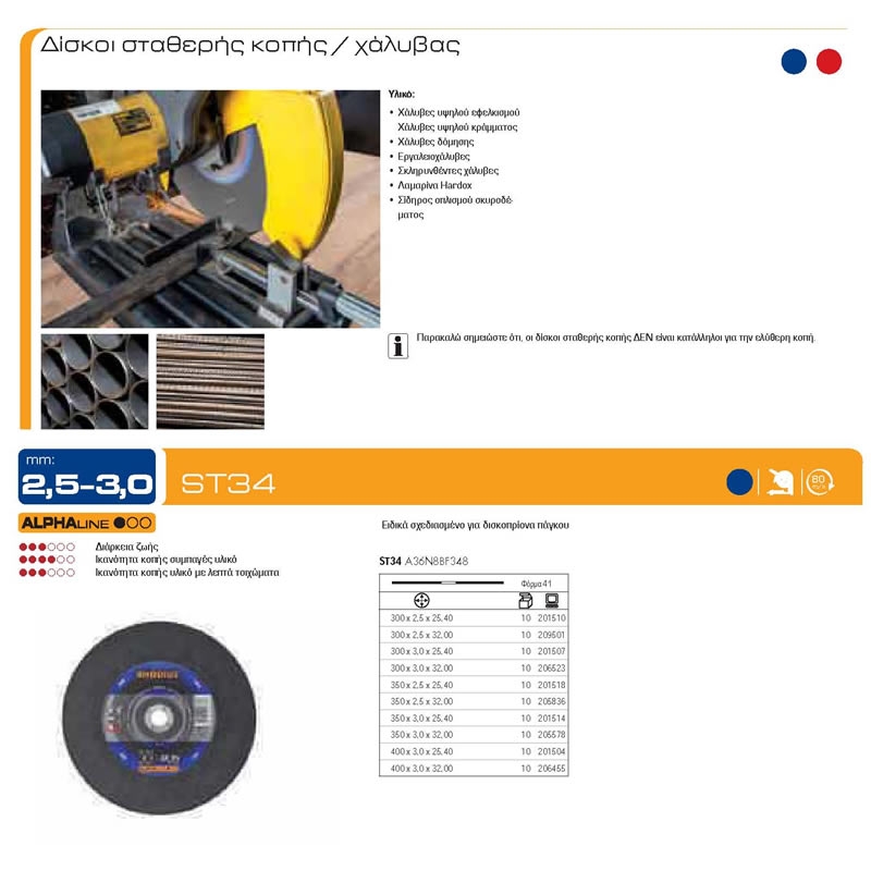 Κοπή στέρεων υλικών, σωλήνων, SML- όλκιμων σωλήνων και προφίλ. Μαλακός τροχός για μηχανήματα χαμηλής ηλεκτρικής οδήγησης και για σταθερά μηχανήματα.